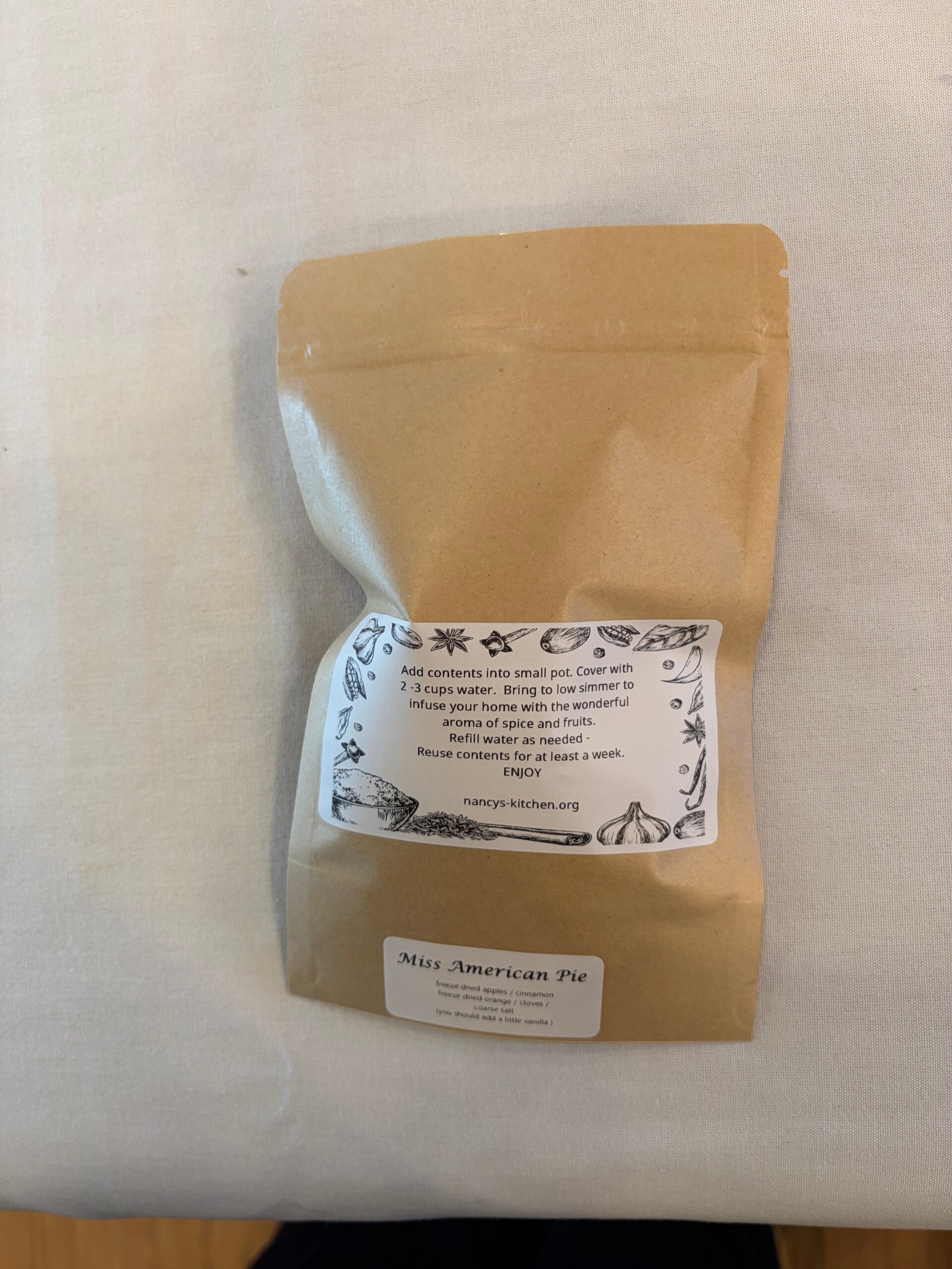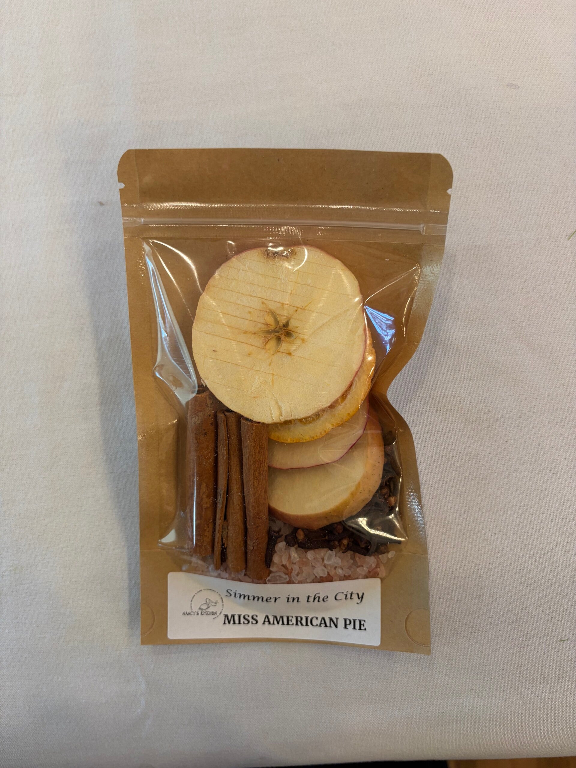 A warm and cozy simmer spice with freeze dried apples, cinnimon sticks, freezed dried oranges, cloves, and cource salt. Add to 2-3 cups of water and let the aroma fill your house, use the contents for atleast a week!